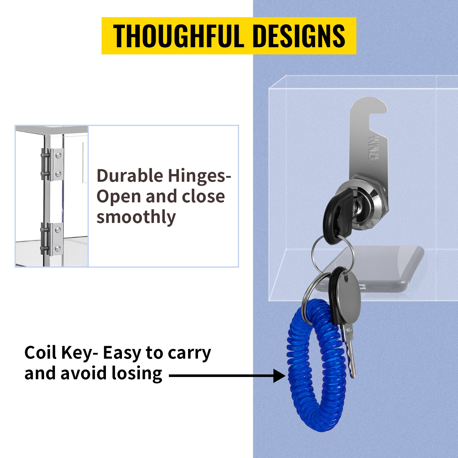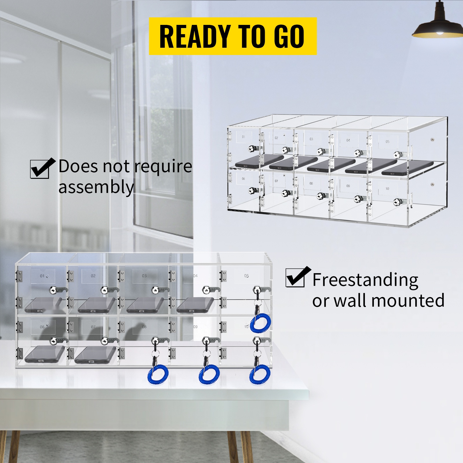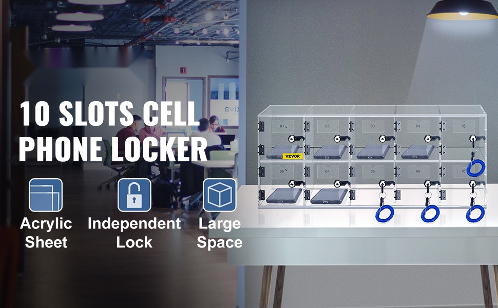 Läpinäkyvä akryylinen puhelinkaappi sopii esimerkiksi toimistoihin, neuvotteluhuoneisiin, elokuvateattereihin, odotustiloihin, kouluihin ja kuntosaleille, missä puhelimet halutaan pitää poissa käytöstä mutta silti turvassa.