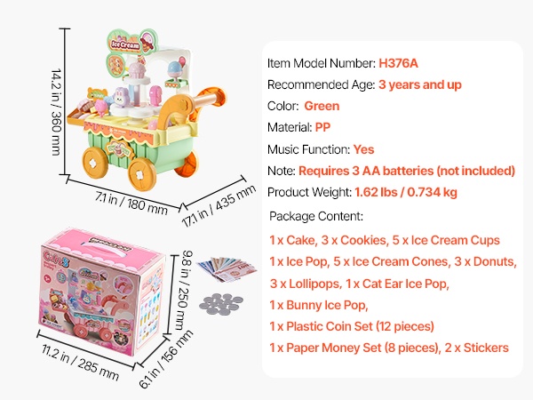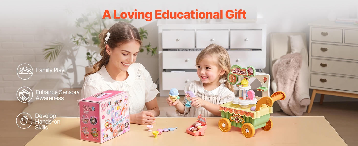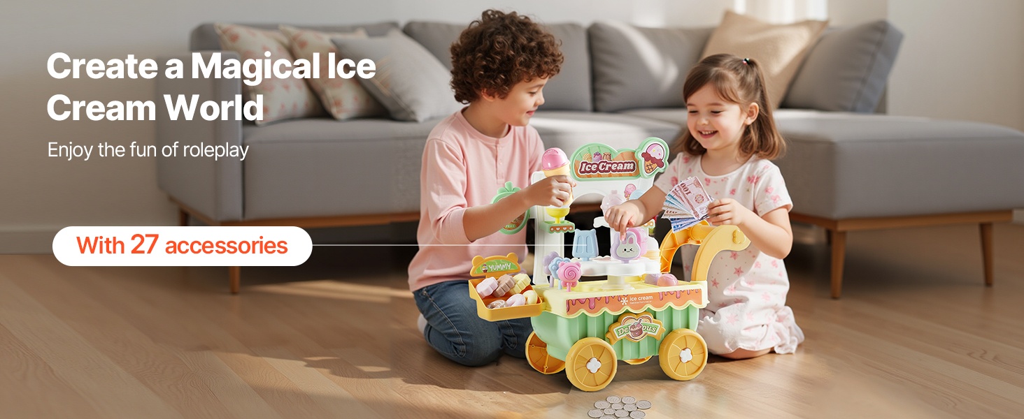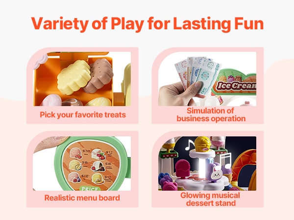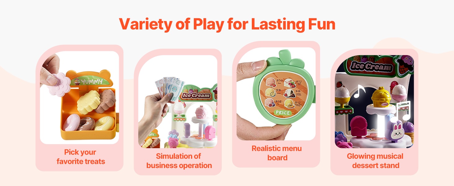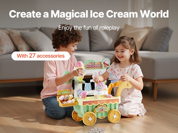 Leikkisetti ei ole vain jäätelöauto, vaan kokonainen jäätelökioski. Palveluluukku, leikkimaksuskanneri ja liitutaulu auttavat lasta eläytymään myyjän rooliin ja kehittämään mielikuvitusta, vuorovaikutusta ja roolileikin taitoja.