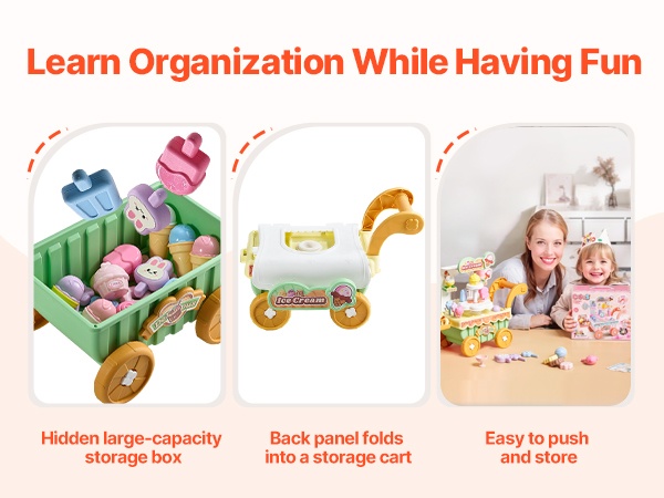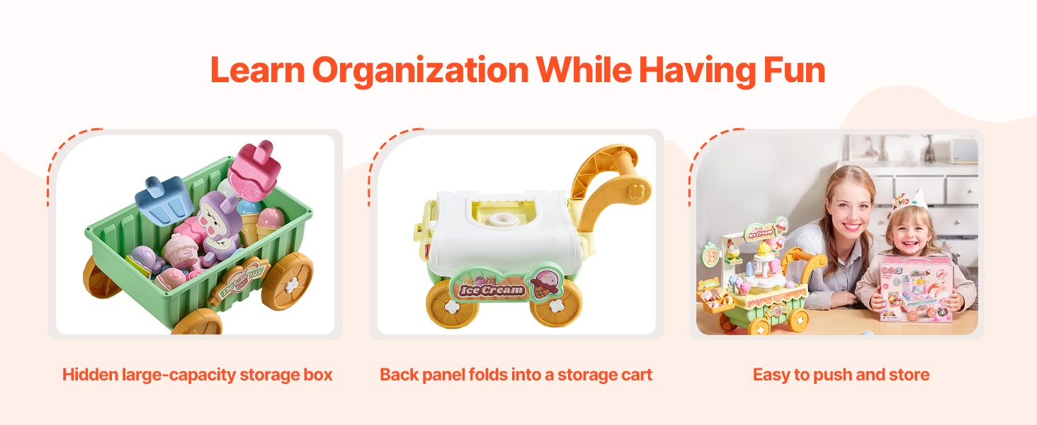 Jäätelöautolla voi tarjoilla leikkiherkkuja ja samalla opetella järjestelmällisyyttä. Runsaat säilytyspaikat helpottavat tarvikkeiden lajittelua ja takaisin paikalleen laittamista leikin päätteeksi.