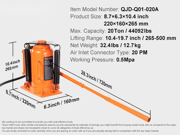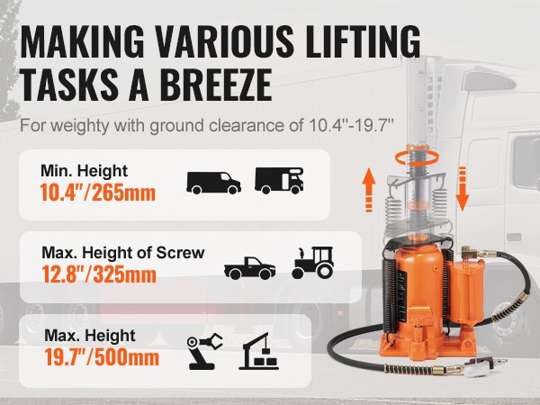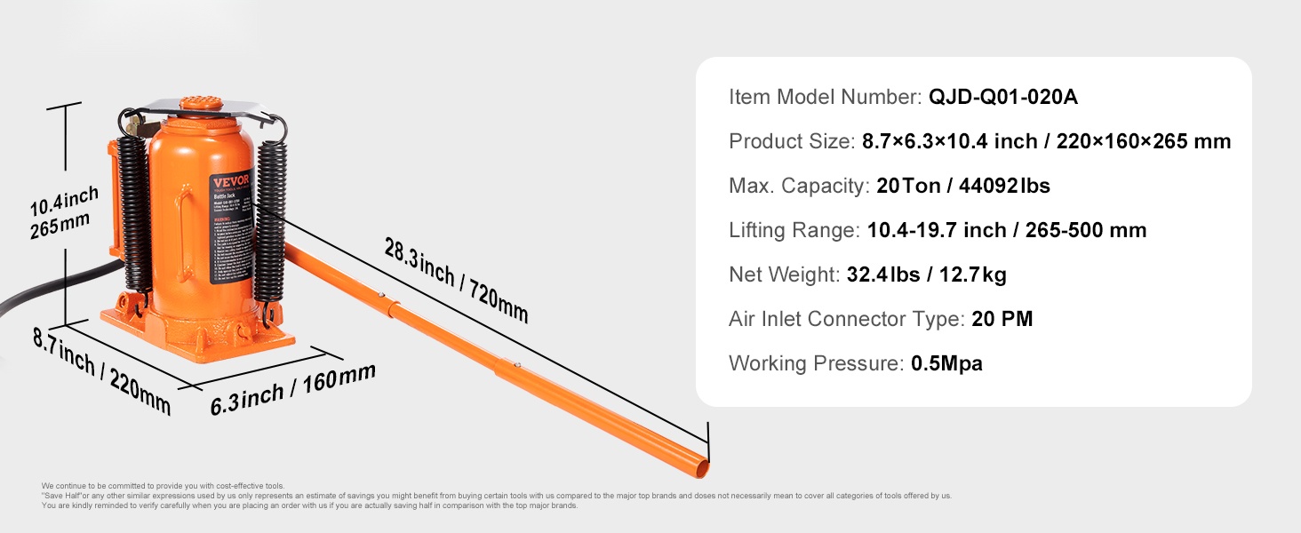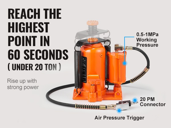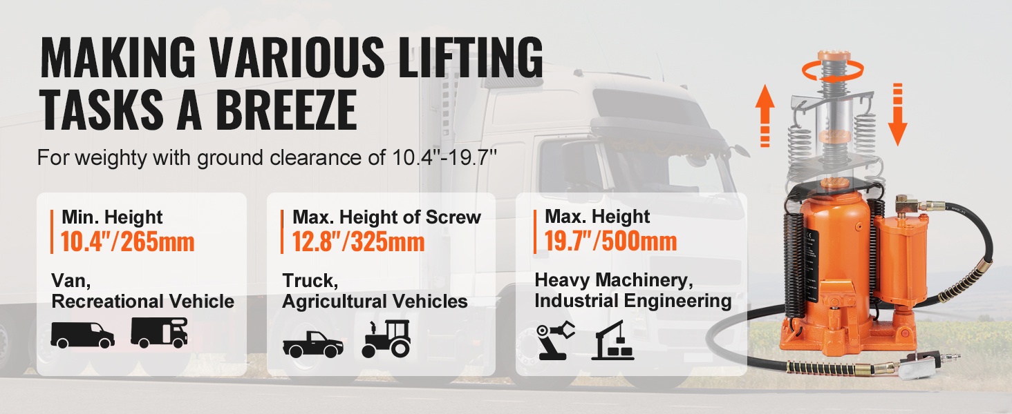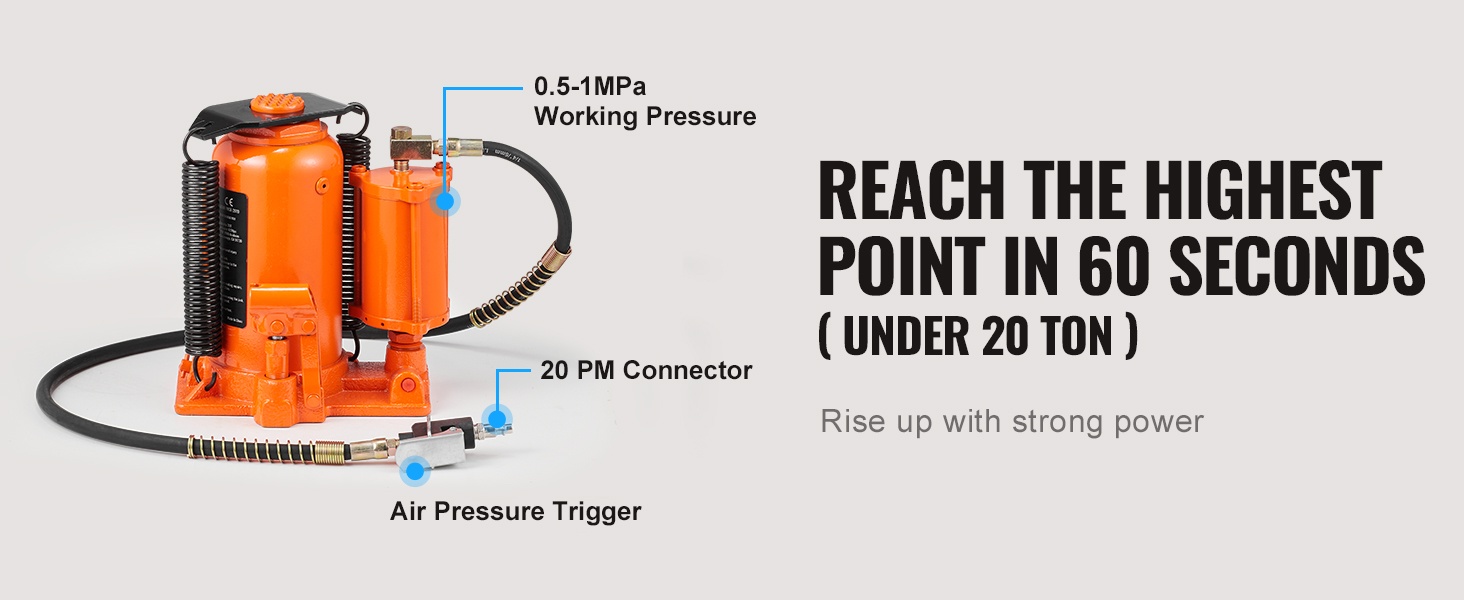Ilmahydraulinen pullotunkki on tehokas työkalu raskaiden kohteiden nostamiseen. Sen kantokyky on 20 tonnia ja säädettävä nostokorkeus 10.4–19.7 tuumaa, joten se mukautuu erilaisiin nostotarpeisiin henkilöautoista ja pakettiautoista raskaampiin ajoneuvoihin.