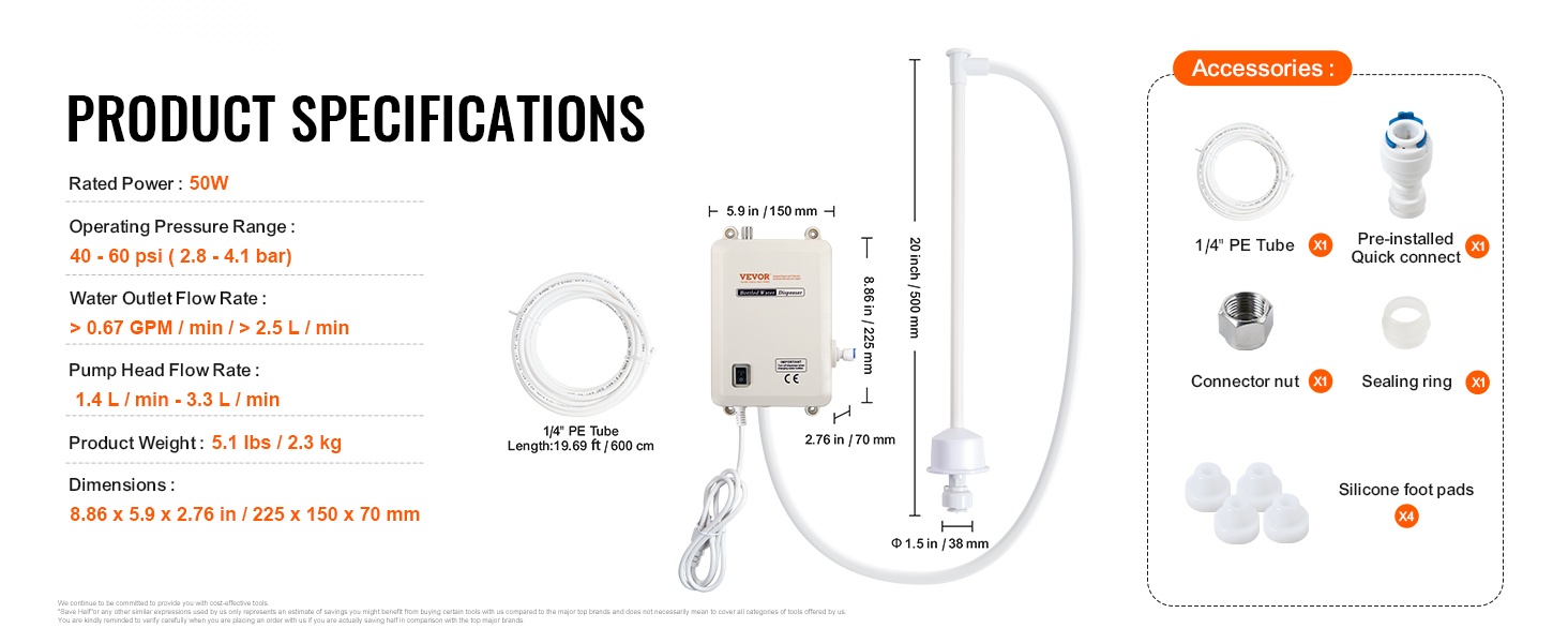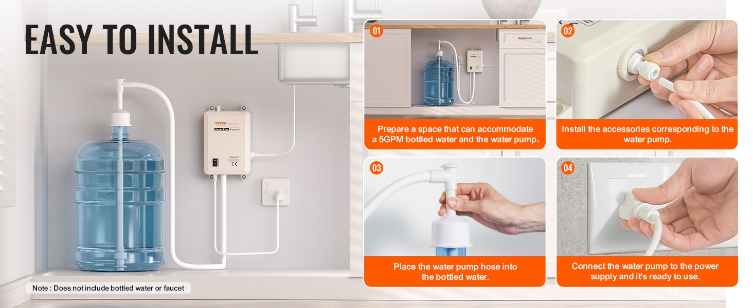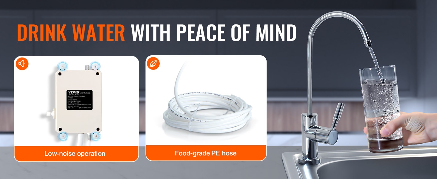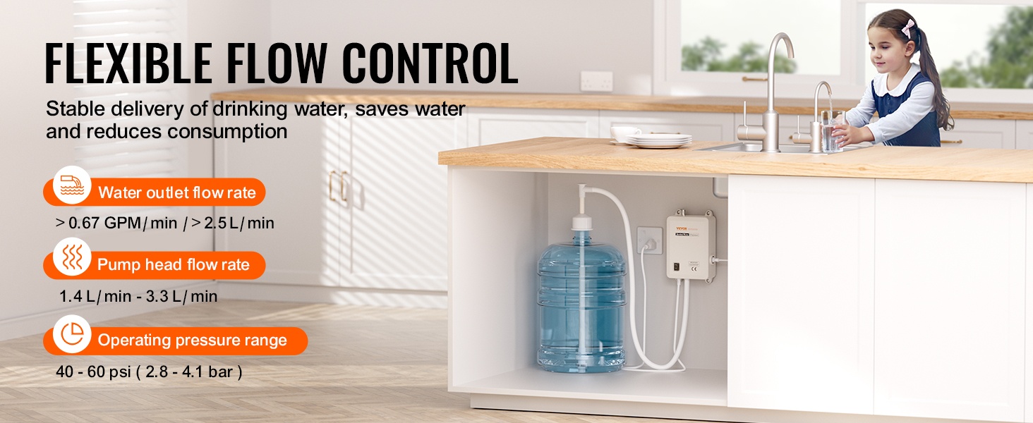 Pumppu toimii 40–60 psi (2.8–4.1 bar) painetason alueella ja tuottaa veden ulostulovirtausta 0.67 GPM/min (2.5 L/min), mikä takaa nopean ja vakaan juomaveden saannin. Pumppupään virtaus on yli 1 GPM/min (>3.8 L/min), joten vettä riittää useille laitteille samanaikaisesti.