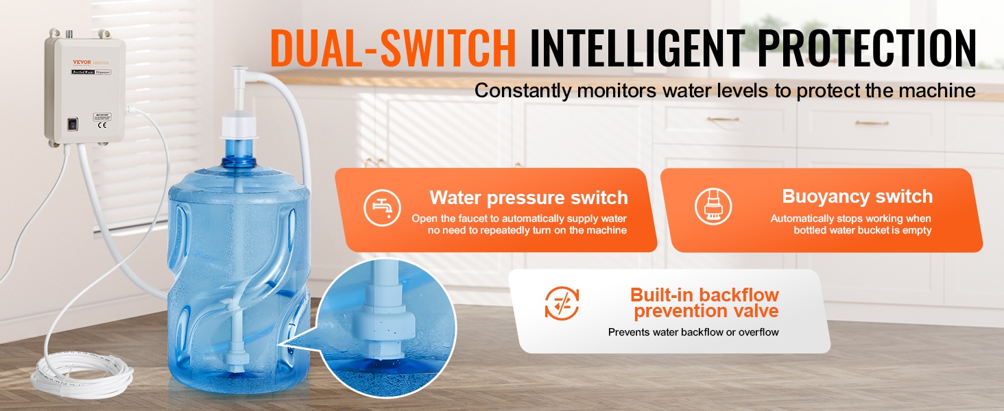 Kellukekytkin tunnistaa vedenpinnan automaattisesti ja pysäyttää pumppaamisen, kun säiliöstä loppuu vesi. Painokytkin mahdollistaa automaattisen veden syötön pelkästään hanaa avaamalla, ilman, että pumppua tarvitsee käynnistää toistuvasti käsin. Tämä lisää käyttömukavuutta ja parantaa turvallisuutta.