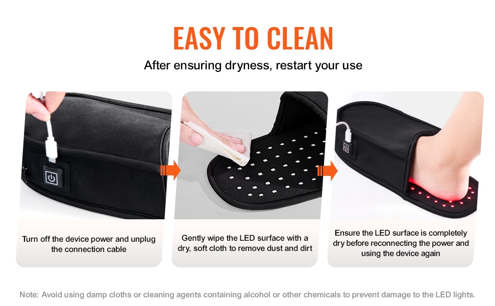 Läpinäkyvä TPU-kalvo tekee vyön puhdistamisesta vaivatonta. Varmista, että laite on täysin kuiva ennen seuraavaa käyttökertaa. Vältä kosteita liinoja sekä alkoholia tai voimakkaita kemikaaleja sisältäviä puhdistusaineita, jotta LED-valot eivät vahingoitu.