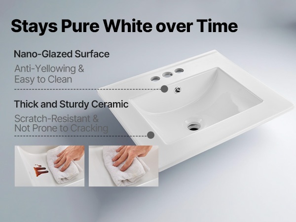 Keraaminen allas on poltettu korkeassa lämpötilassa ja viimeistelty nano-lasitteella, joka hylkii vesijälkiä, saippuajäämiä ja naarmuja. Pinta pysyy kirkkaana ja sileänä, ja päivittäinen puhdistus on vaivatonta.