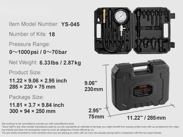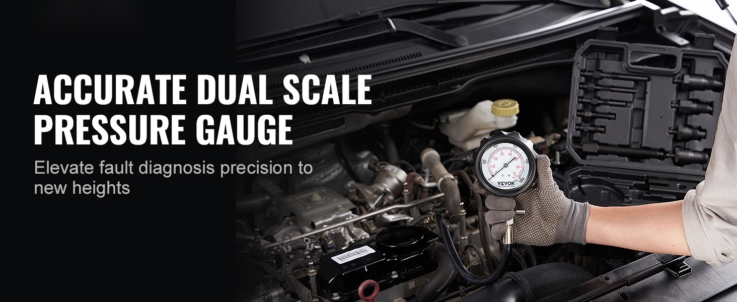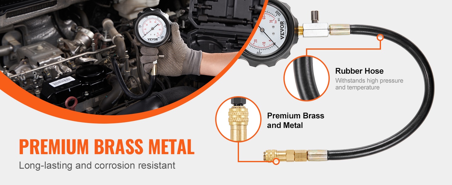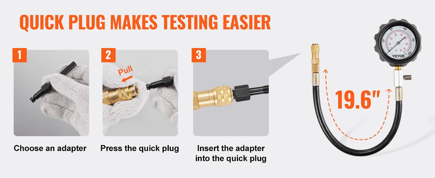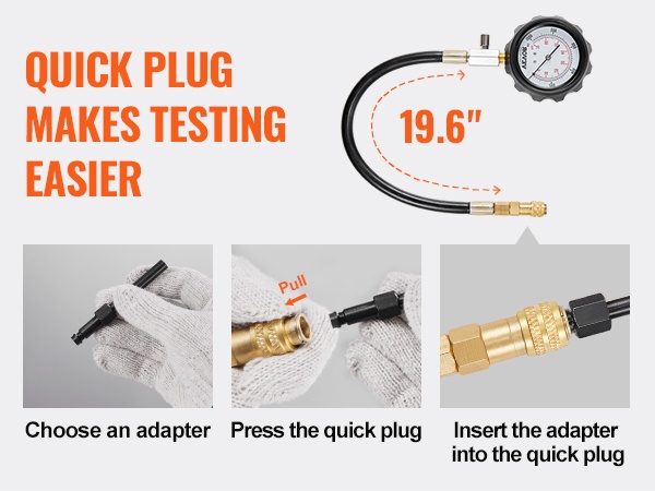 25-tuumainen lisäpituinen letku, laadukas painemittari ja pikaliitinosat mahdollistavat käytön monesta kulmasta ja asennosta. Tämä helpottaa työskentelyä ahtaissa moottoritiloissa ja nopeuttaa mittausprosessia.