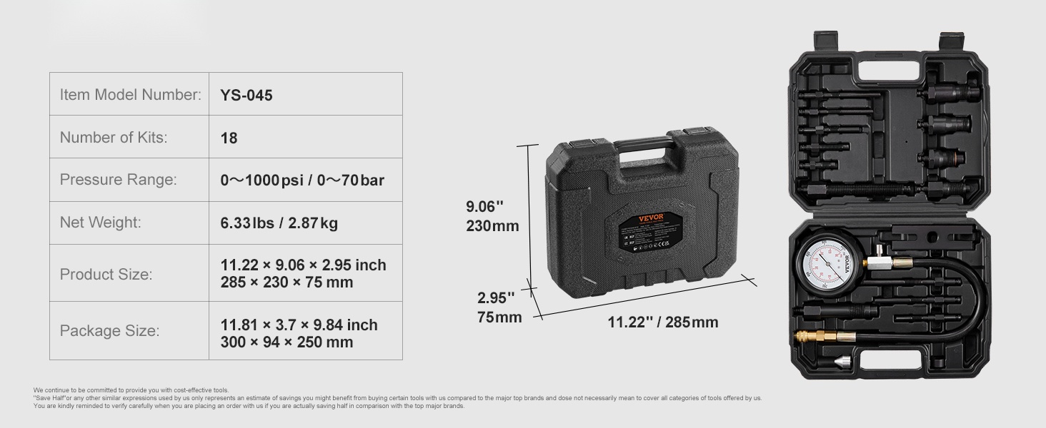 Monipuolinen puristuspaineen testaussetti bensiinimoottoreiden sylinterien kunnon tarkkaan mittaamiseen. Kaksiasteikkoinen painemittari, pitkät letkut ja useat adapterit tekevät käytöstä helppoa sekä henkilöautoissa että erikoisemmissa ajoneuvoissa.