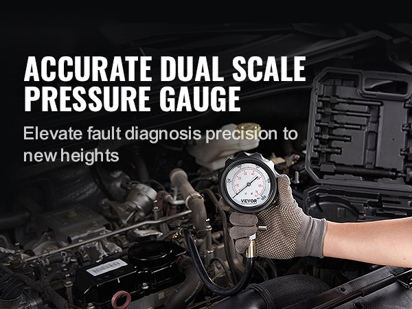 Kaksiasteikkoinen painemittari näyttää paineen selkeästi alueella 0–300 psi ja 0–2000 kPa. Tarkan mittauksen avulla voit arvioida sylinterien kunnon, havaita vuodot ja vertailla paineita sylinterien välillä luotettavasti.