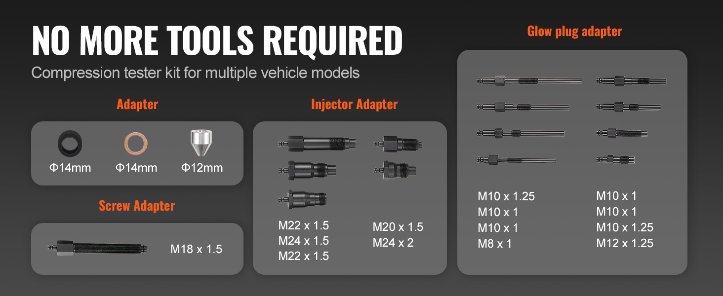 Testaussettiin kuuluu 5 erilaista adapteria, jotka sopivat yleisiin 18mm, 12mm ja 10mm kierteisiin sekä sisältävät pikaliittimiä ja erikoisadaptereita. Näin työkalu soveltuu sekä tavanomaisiin ajoneuvomalleihin että erikoiskohteisiin.