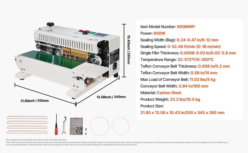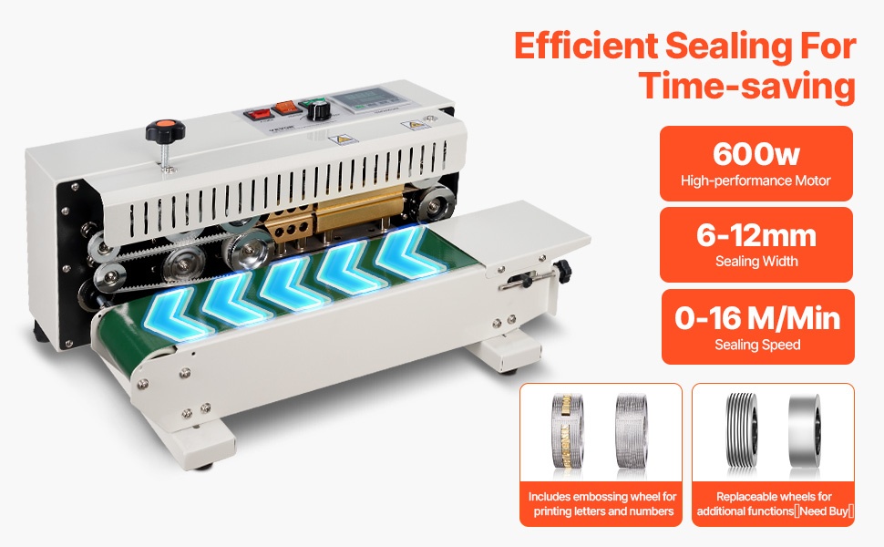 Koneella voi tulostaa numeroita ja päivämääriä saumaan. Säädettävä suljennan leveys 0.24–0.47 in/6–12 mm mahdollistaa käytön erilaisille paksuuksille ja pusseille. Suljennanopeus jopa 0–52.49 ft/min (0–16 m/min) tukee tehokasta tuotantoa.