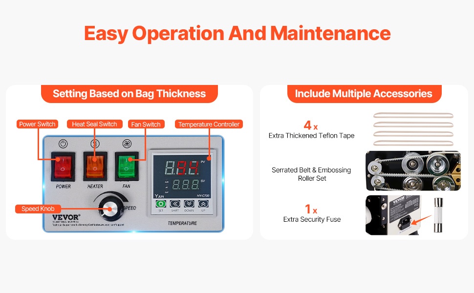 Selkeä ohjauspaneeli ja mukana tulevat lisävarusteet helpottavat käyttöä ja ylläpitoa. Asetuksia voi säätää nopeasti eri pussipaksuuksille, jolloin suljennan laatu pysyy tasaisena.
