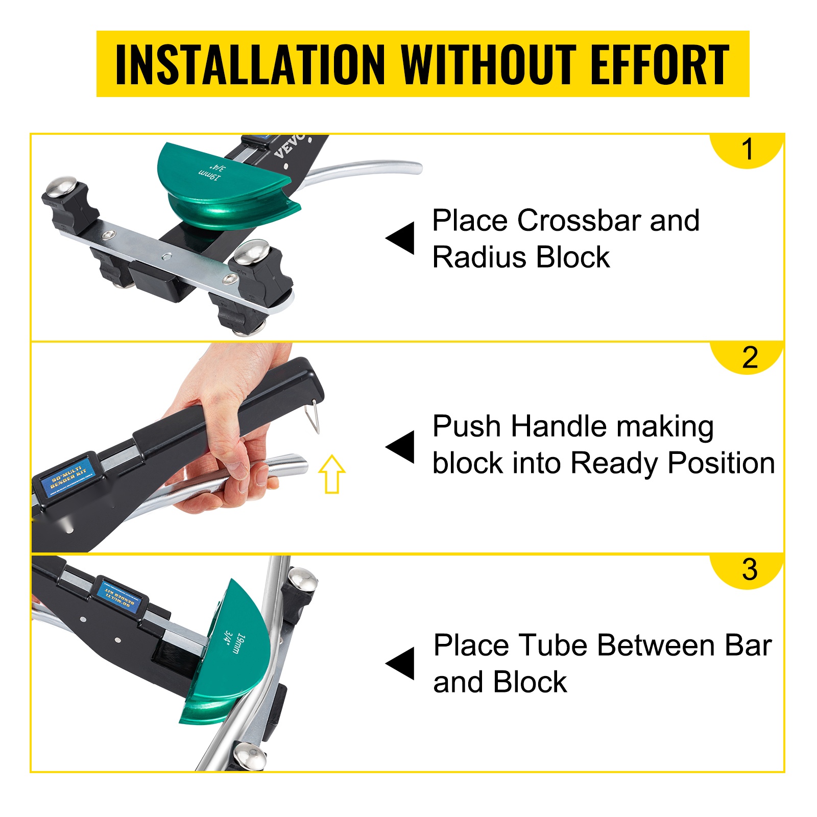 Takaisintaivutuksen asennus: aseta ensin poikkitanko ja sädepalikka, paina sitten kahvaa, kunnes palikka on valmiusasennossa, ja lopuksi aseta putki tangon ja palikan väliin ennen taivutuksen aloittamista.