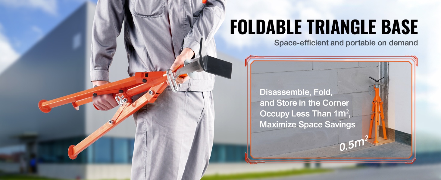 Kolmionmuotoinen jalusta on irrotettava ja taitettava, mikä helpottaa telineen kuljettamista ja varastointia. Teline vie vain vähän tilaa, kun se ei ole käytössä.