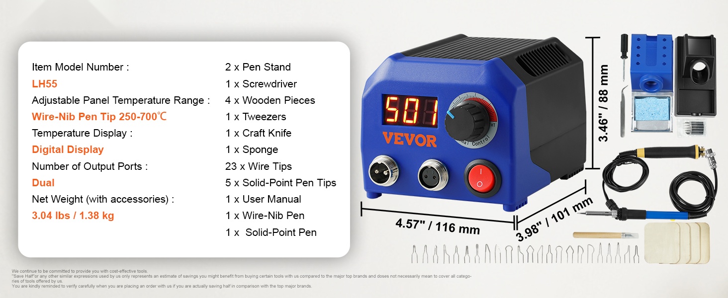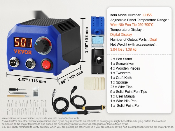 - Laaja tarvikepakkaus: polttokynä, 23 terää, kynäteline, puupalat ja perus työkalut