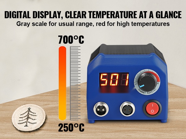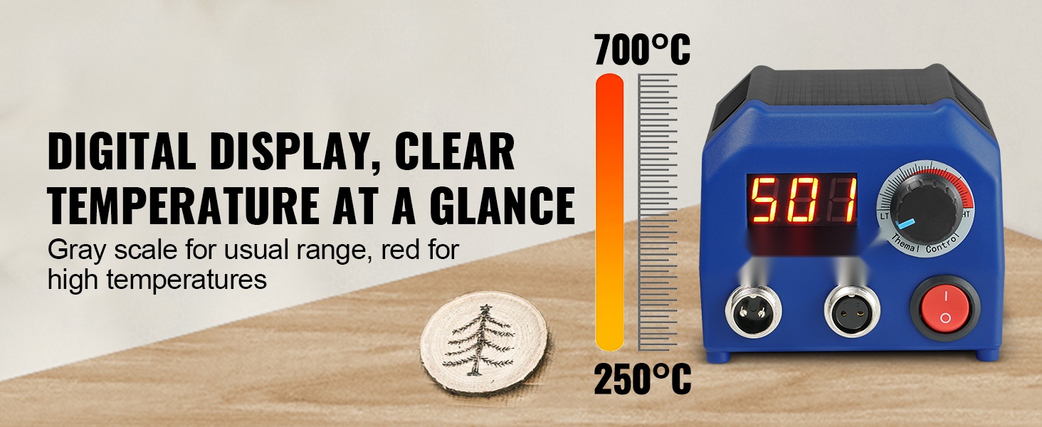 Digitaalinen näyttö kertoo aina ajantasaisen lämpötilan, joten sinun ei tarvitse arvailla. Säädettävä 200–700°C lämpötila-alue mahdollistaa sopivan lämmön valinnan eri materiaaleille ja työskentelytavoille.