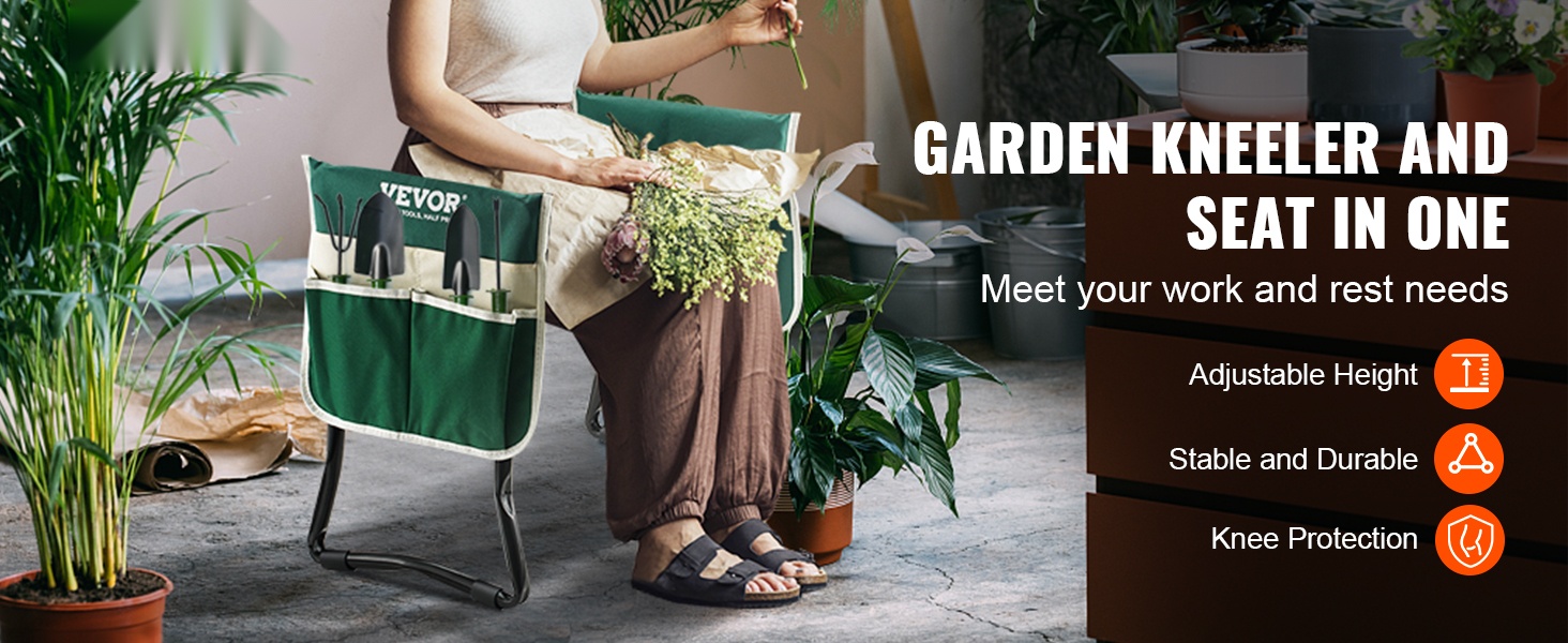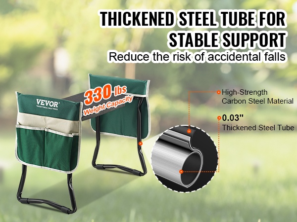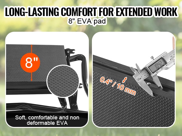 Tässä yhdistyvät kätevä istuin ja tukeva polvistumistuki, jotka helpottavat kaikenlaisia puutarhatöitä. 10" EVA-pehmustetyyny tukee polvia ja vähentää rasitusta, ja runko kestää jopa 300 pounds kuorman tarjoten luotettavan tuen eri työasentoihin.