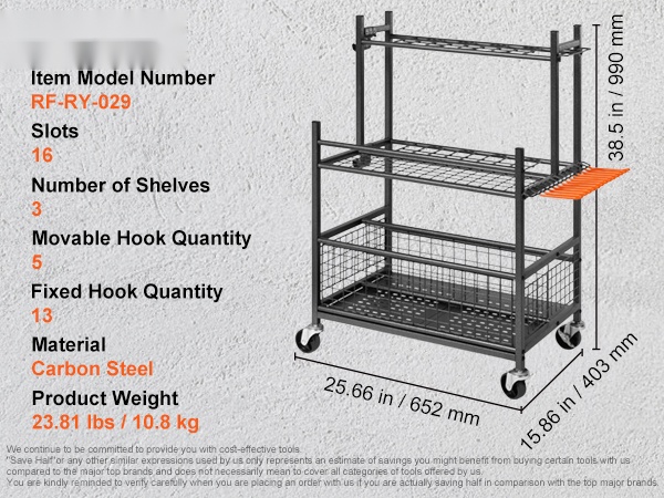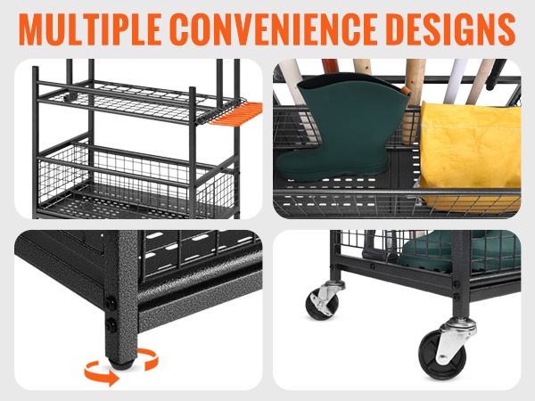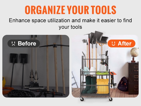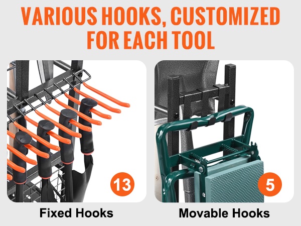 Tämä puutarhatyökalujen säilytysteline auttaa pitämään haravat, lapiot, harjat ja muut pitkällä varrella varustetut työkalut hyvässä järjestyksessä. Telineessä on 10 paikkaa ja koukkuja erimuotoisille ja -kokoisille työkaluille, joten lattiatila vapautuu ja työskentelyalue pysyy siistinä.