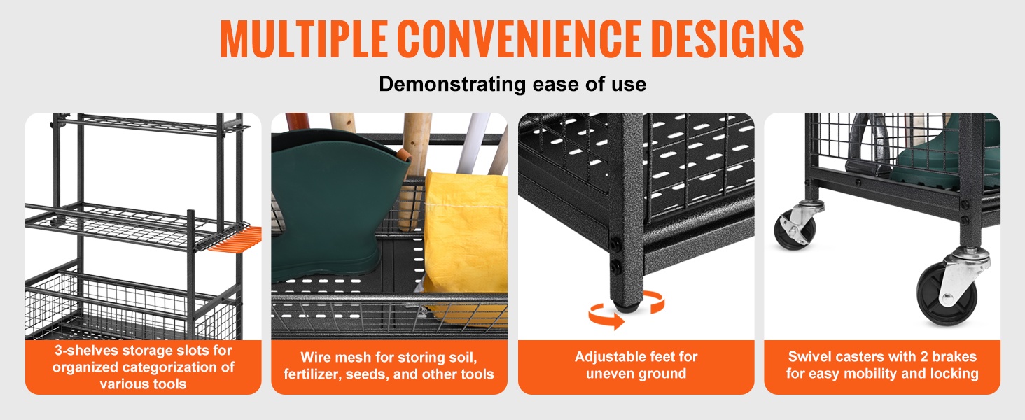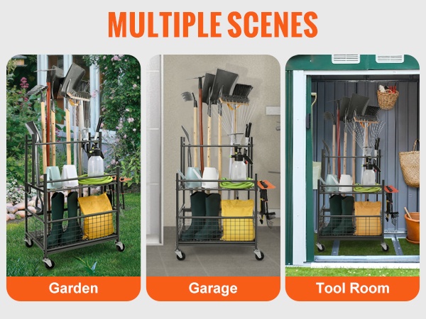 Teline auttaa pitämään puutarhatyökalut selkeästi järjestyksessä, jotta oikea työkalu löytyy nopeasti. Työkalut pysyvät pystyssä ja erillään toisistaan, mikä vähentää naarmuuntumista ja kolhiintumista.