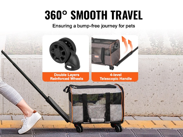 Paksunnetut 360 asteen kääntyvät pyörät ovat kestävät ja kulutusta sietävät. Ne vaimentavat tärinää ja kulkevat hiljaisesti erilaisilla alustoilla, mikä tekee liikkumisesta miellyttävämpää sekä omistajalle että lemmikille.