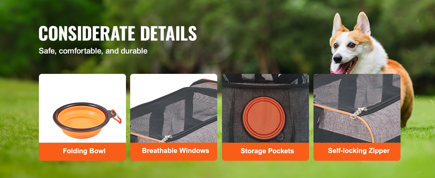600D Oxford -kangas on kulutusta kestävää ja helppo puhdistaa. 3-sivuiset verkkoverkkoikkunat tuovat runsaasti raitista ilmaa ja auttavat vähentämään matkustusstressiä, kun lemmikki näkee ympäristönsä. Itselukittuva vetoketju auttaa pitämään lemmikin turvallisesti kantolaukussa matkan aikana.