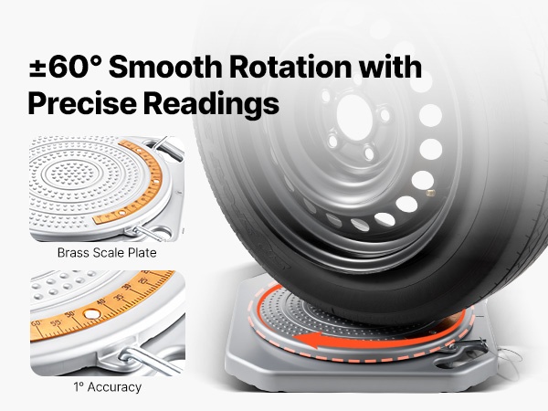 60° kääntöalue (30° vasemmalle ja oikealle) kattaa useimpien henkilöautojen ohjauskulmat. Messinkiset asteikkonäytöt ovat helppolukuiset ja pitkäikäiset, mikä helpottaa tarkkojen auraus- ja camber-kulmien mittaamista.