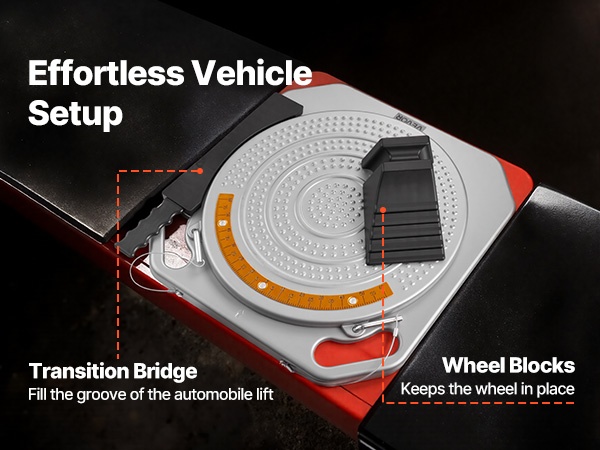 Auton suuntauslevyn keskiosa sallii jopa 1 in/25.4 mm sivuttaissiirtymän, joten pyörät pysyvät keskitettyinä, vaikka autolla ei ajettaisi täysin suoraan levyille. Vankat lukitukset pitävät levyt tukevasti paikoillaan käytön aikana.