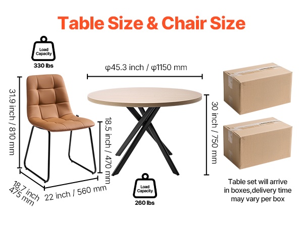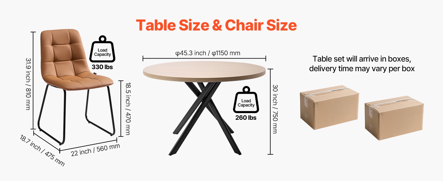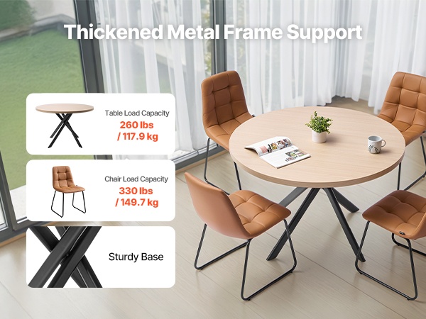 Paksut metalliputkesta valmistetut jalat ja runko antavat ruokailuryhmälle tukevan ja vakaan rakenteen. Ruokapöydän enimmäiskantavuus on 260 lbs / 117.9 kg, ja jokainen tuoli kestää 330 lbs / 149.7 kg. Voit nauttia aterioista ilman huojuvaa tunnetta.