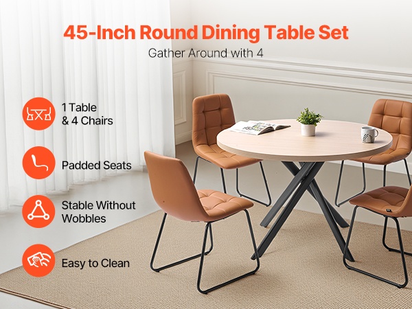 Pyöreä 45-tuumainen ruokapöytäsetti MDF-pöytälevyllä ja 4 keinonahkatuolia