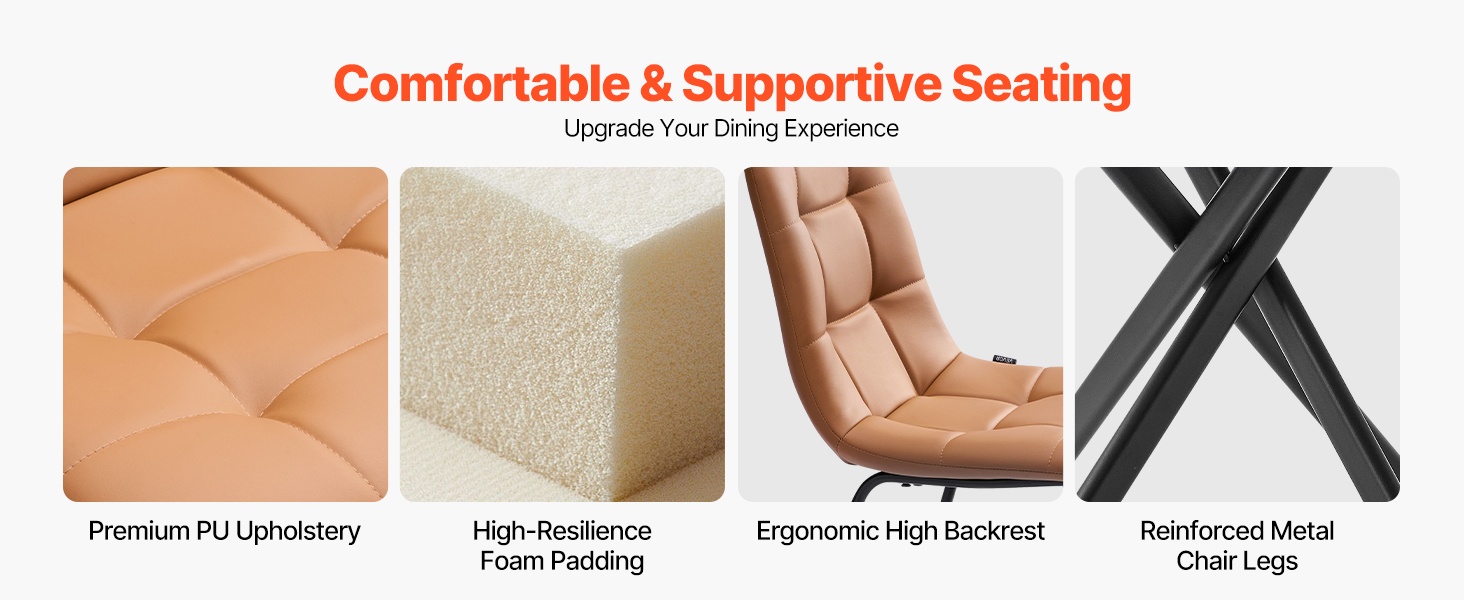PU-nahkatuolit ovat vedenkestävät, kulutusta kestävät ja helppo pyyhkiä puhtaaksi. Korkealaatuinen, kimmoisa vaahtopehmuste pysyy pehmeänä painumatta kasaan, ja ergonomisesti muotoiltu korkea selkänoja tukee selkärankaa. Lujat metallijalat tarjoavat staattisen kantavuuden 330 lbs / 149.7 kg per tuoli, joten tuolit sopivat hyvin päivittäiseen käyttöön.