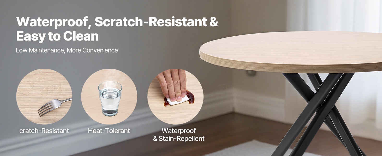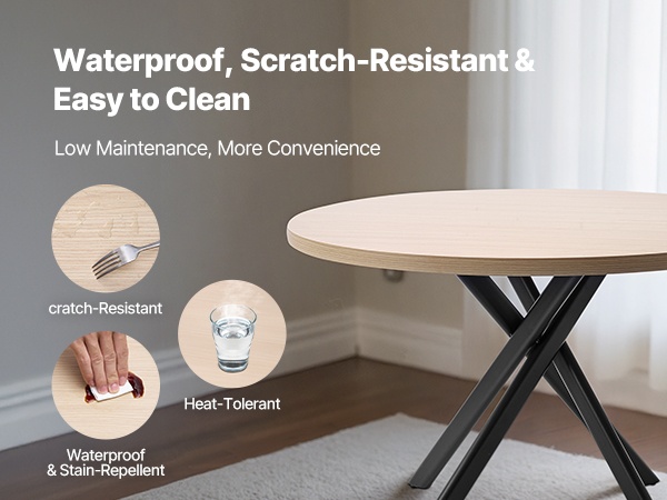 MDF-pöytälevyssä on tiivis ja naarmuja hyvin kestävä pinta, joka suojaa aterimien ja astioiden jäljiltä syntyviltä jäljiltä. Vesi- ja tahroja hylkivän viimeistelyn ansiosta kahvi- ja keittoläikät voi pyyhkiä helposti pois. Hyvä lämmönkesto auttaa ehkäisemään vaurioita kuumista astioista ja vähentää pöydän päivittäistä hoitotarvetta.
