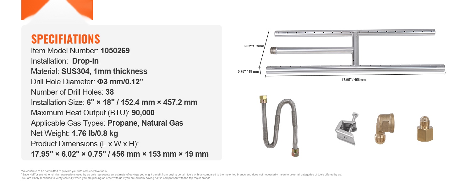 CSA-sertifioitu 1/2" kaasuhana ja tarkasti poratut liekkireiät auttavat tuottamaan tasaisen ja hallitun liekin. Selkeä käyttö- ja asennusohje helpottaa asennusta myös vähemmän kokeneille käyttäjille, jolloin voit nauttia lämmöstä ilman monimutkaisia työvaiheita.