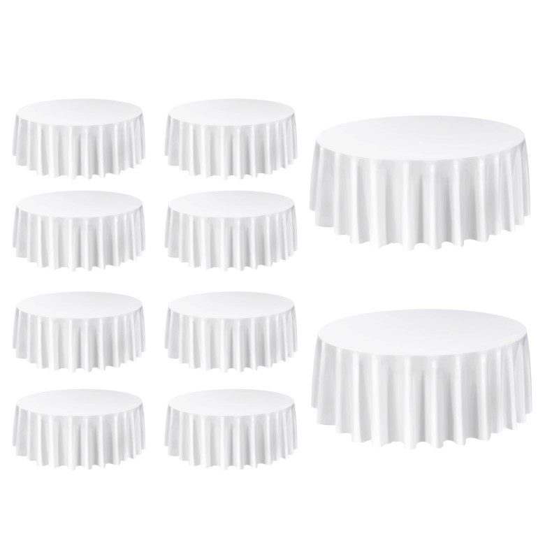 Pyöreät valkoiset pöytäliinat juhliin, tilaisuuksiin ja arkeen. Pakkauksessa on 10 kpl pöytäliinoja, joiden halkaisija on 120 inch / 3048 mm. Polyesterikangas tuntuu miellyttävältä ihoa vasten, hengittää hyvin ja laskeutuu siististi pöydän ympärille.