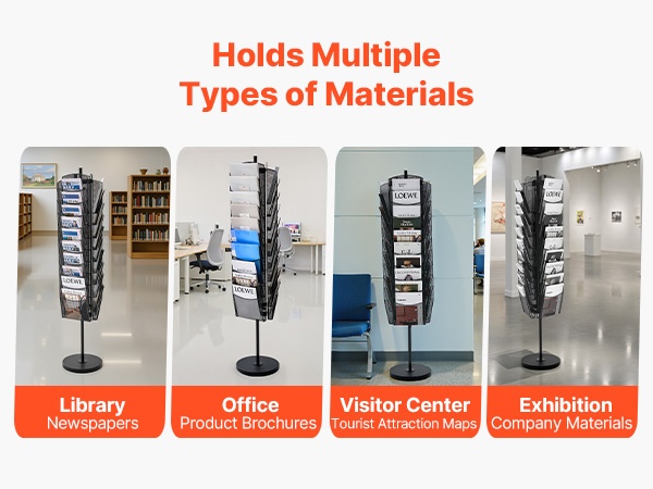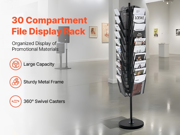 Pyörivä esiteteline, jossa on 30 lokeroa, auttaa järjestämään ja esittelemään selkeästi erilaisia esitteitä, asiakirjoja, lehtiä ja muuta materiaalia. Se soveltuu hyvin toimistoihin, neuvotteluhuoneisiin, kirjastoihin, messuille ja myymälöihin, joissa materiaali halutaan pitää helposti nähtävillä ja siistissä järjestyksessä.