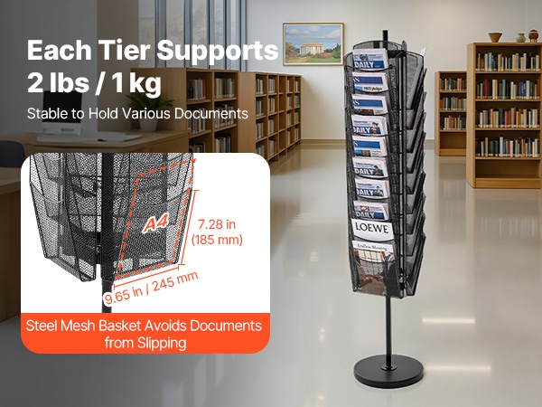 Jokainen taso kestää jopa 2 lbs / 1 kg painon, joten teline tukee luotettavasti eri paksuisia asiakirjoja ja esitteitä. Myös useamman materiaalin pinoaminen yhteen lokeroon onnistuu, ja teline pysyy tukevasti pystyssä ilman kaatumisen tai kallistumisen riskiä.
