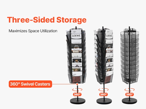 Kolmisivuinen säilytysratkaisu hyödyntää tilan tehokkaasti. Teline pyörii 360°, joten voit säätää esillepanon kulmaa tarpeen mukaan ja varmistaa, että sisältö on hyvin nähtävissä kaikista suunnista.