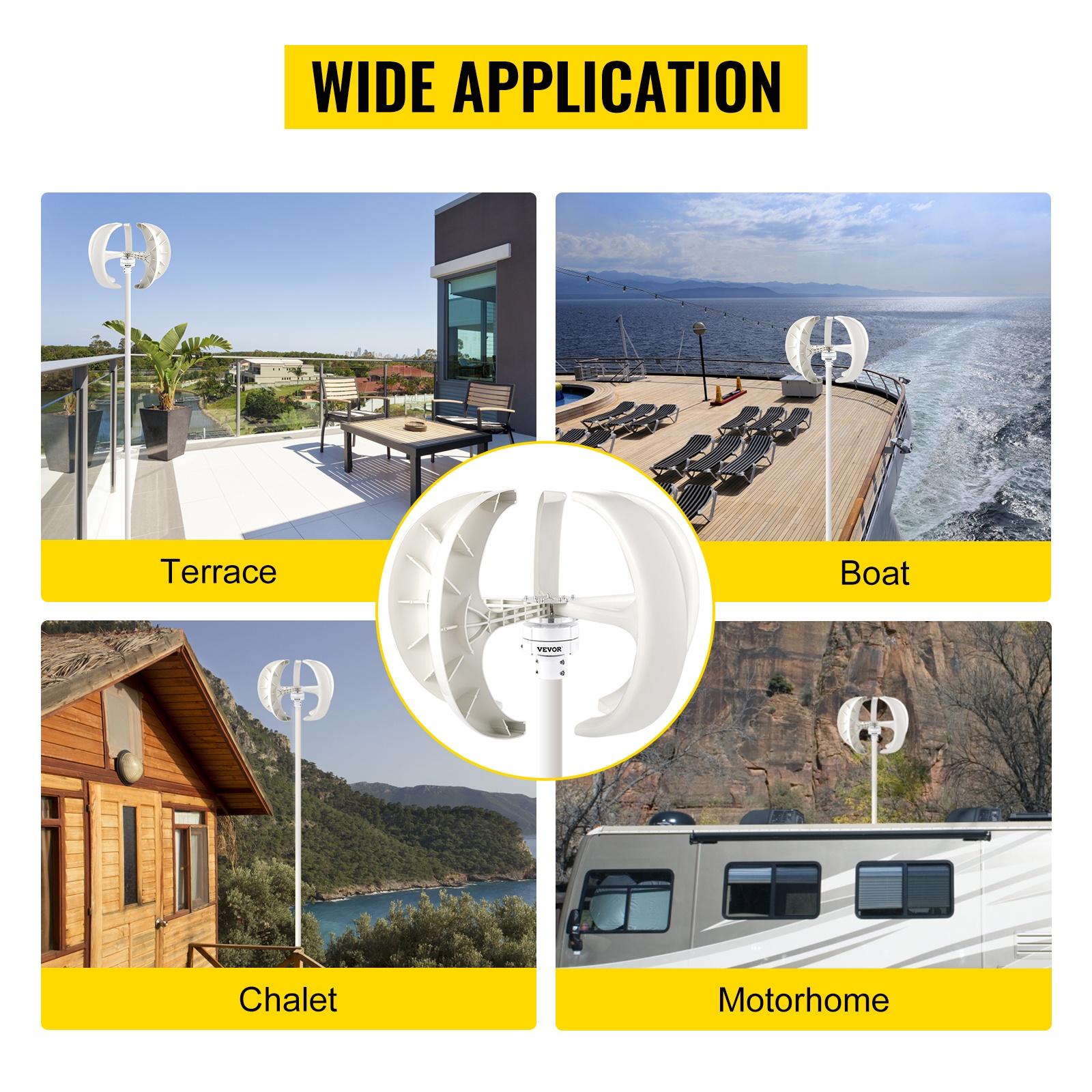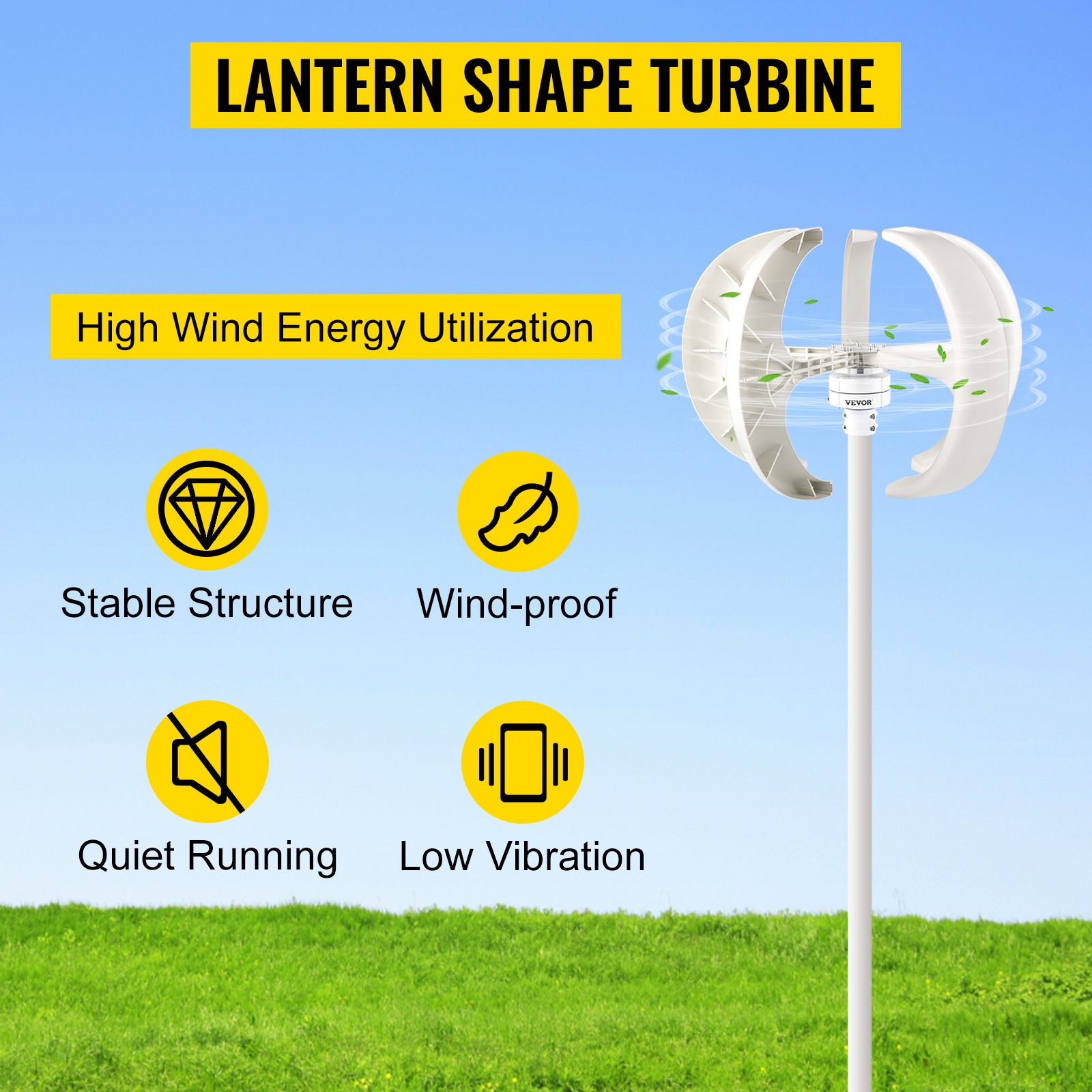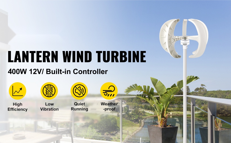 Valkoinen lyhtymallinen pystyakselinen tuuligeneraattori, jonka teho on 600W ja jännite 12V, soveltuu lisäenergiaksi esimerkiksi mökille, pienkohteisiin, valvontakäyttöön sekä veneisiin. Vahvistetusta nailonkuidusta valmistetut lavat ja yksivaiheinen kestomagneettigeneraattori mahdollistavat pienen käynnistystuulen, matalan tärinän ja hiljaisen käynnin.