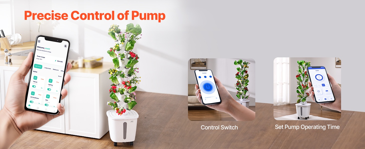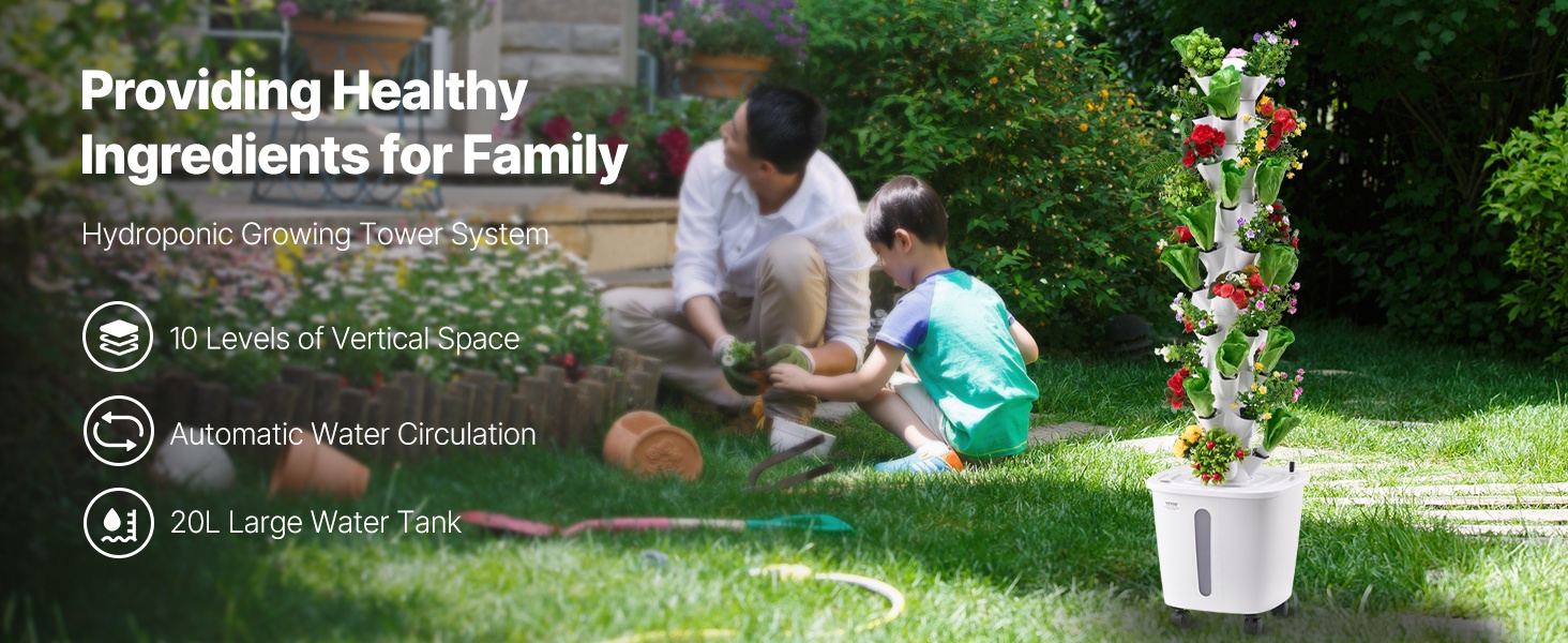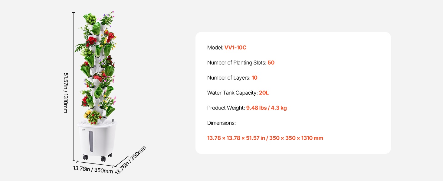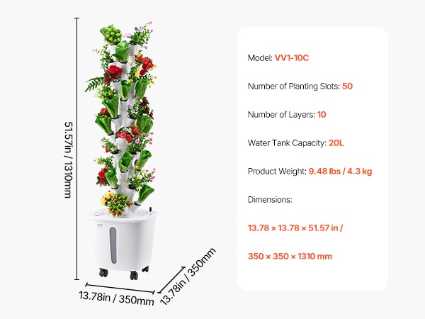 Tämä 10-kerroksinen pystysuora vesiviljelytorni on valmistettu PP-materiaalista ja soveltuu hyvin vihanneksille ja kukille. 20L vesisäiliö ja kiertävä kastelujärjestelmä tukevat kasvien tervettä kasvua. Älykäs pistorasia mahdollistaa tarkan ohjauksen valolle ja vesipumpun toiminta-ajoille, joten käyttö on helppoa ja täysin mullatonta – kätevä tapa rakentaa oma sisäpuutarha.