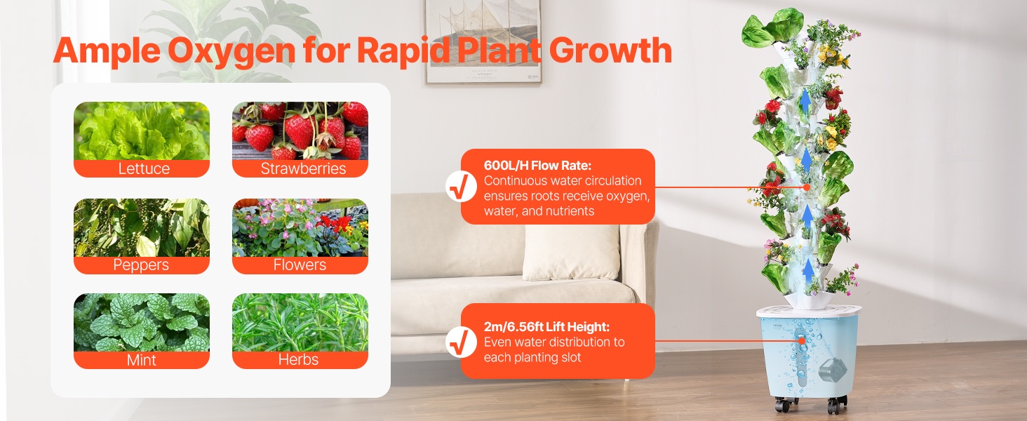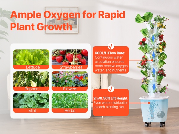Järjestelmän virtausnopeus on 600L/H, mikä tuo runsaasti happea juuristoille ja tukee vahvaa kasvua. 2m / 6.56ft nostokorkeus varmistaa tasaisen veden jakautumisen kaikkiin 50 istutuspaikkaan, jotta kasvit saavat kosteutta ja ravinteita kauttaaltaan.