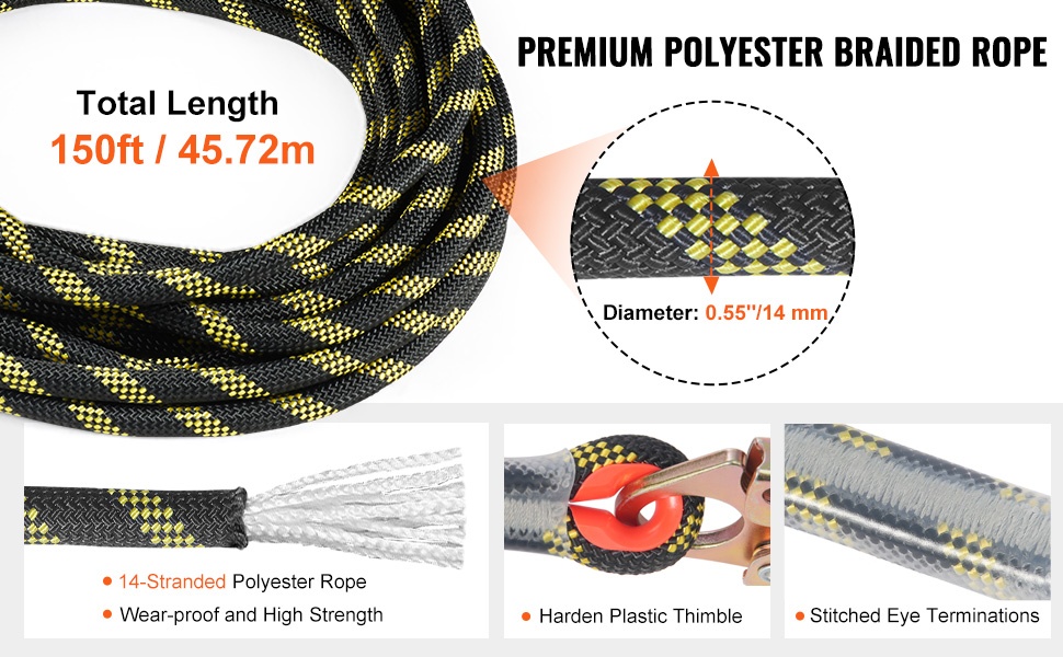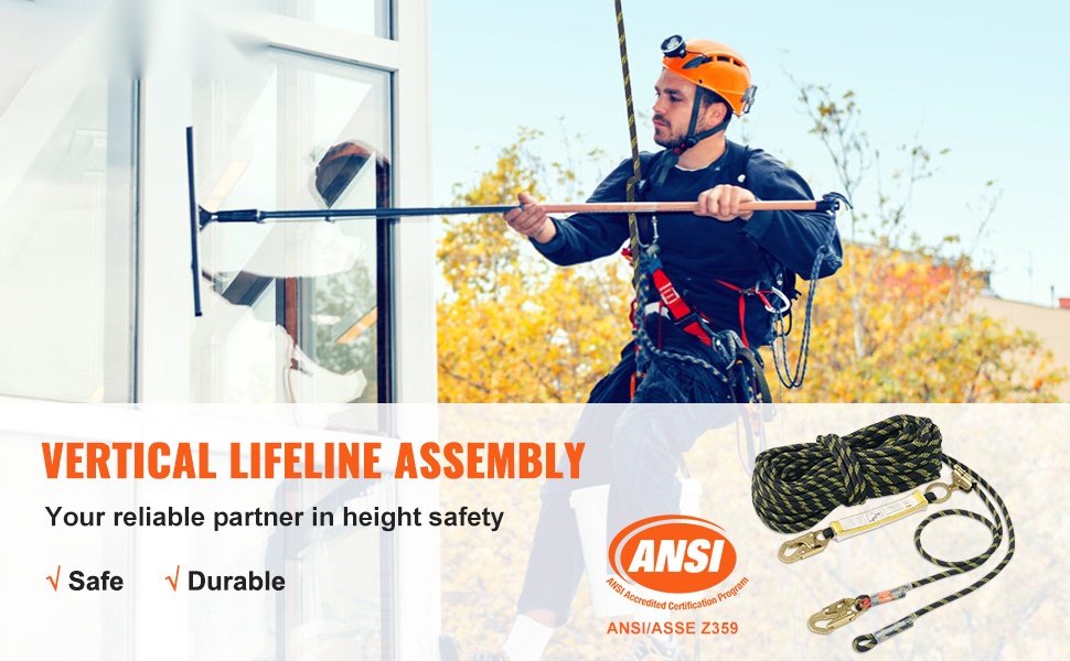 Pystysuuntainen turvaköysi korkealla työskentelyyn ja kiipeilyyn. 150 ft (45.72 m) staattinen polyesteriköysi yhdistää suuren 30 kN murtolujuuden, teräksiset pikalukot ja säädettävän köysilukon turvalliseen liikkumiseen pystysuunnassa.