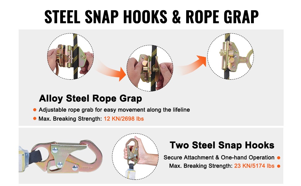 Turvaköydessä on kaksi teräksistä pikalukkoa, joiden murtolujuus on 23 kN (5174 lbs), mikä varmistaa tukevan kiinnityksen turvavarusteisiin. Säädettävä köysilukko (murtolujuus 12 kN / 2698 lbs) mahdollistaa sujuvan liikkumisen pitkin köyttä ja helpottaa käyttöä.