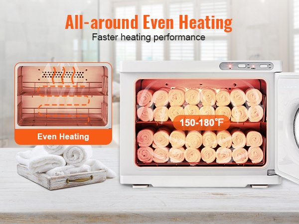 Kaikilta sivuilta tapahtuva lämmitysjärjestelmä takaa tasaisen tuloksen. 360° tasaista lämmitystä hyödyntävä laite lämmittää pyyhkeet noin 150-180℉ (65.55-82.22℃) lämpötilaan noin 10 minuutissa.