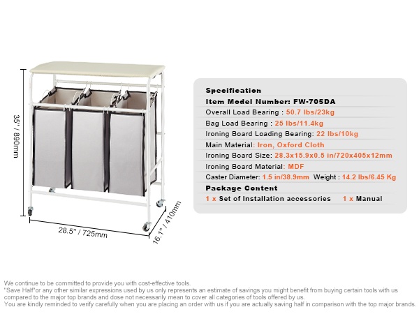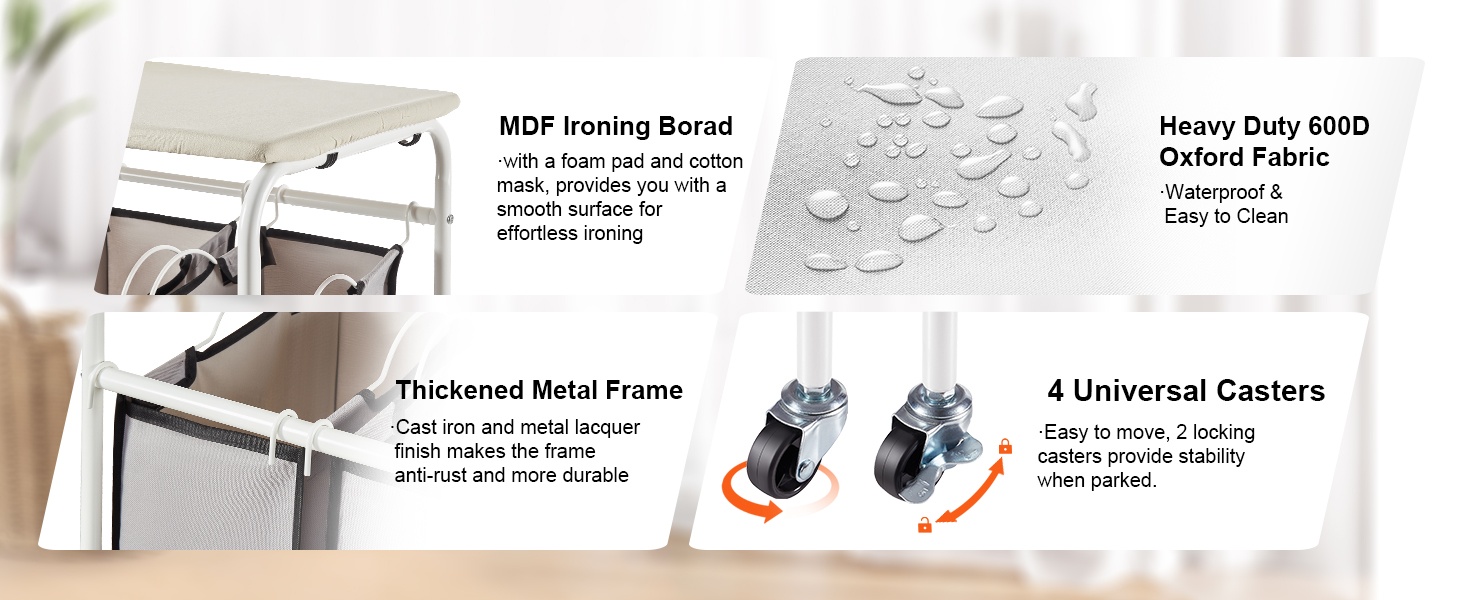 Pussit on valmistettu paksusta 600D Oxford -kankaasta, joka on vettä hylkivä ja helppo puhdistaa. Paksunnettu metallirunko lisää vakautta ja kantavuutta, joten kärry kestää jokapäiväistä käyttöä kotona.