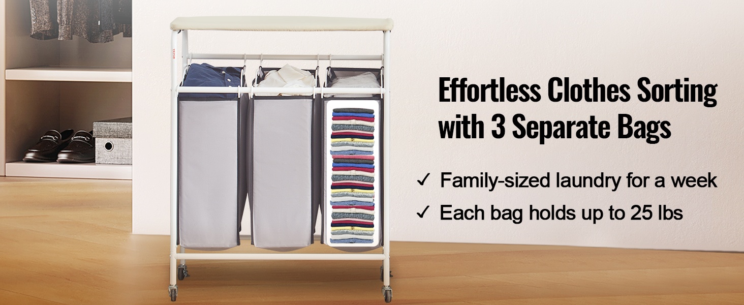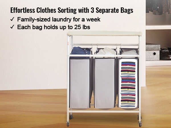 Pyykkikärryssä on neljä suurta pussia, joihin voit lajittaa pyykin esimerkiksi värin, materiaalin tai käyttötarkoituksen mukaan. Jokainen pussi on irrotettava, joten pyykin vieminen pesutupaan käy kätevästi ilman koko kärryn siirtelyä.