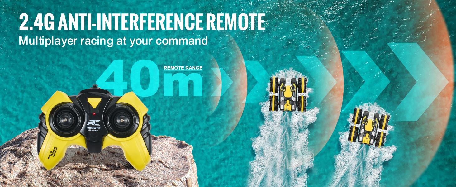 2.4G-teknologia takaa tasaisen ja häiriöttömän ohjauksen jopa 164 ft/50 m etäisyydeltä. Useampi vene voi ajaa samassa paikassa samaan aikaan, ja kantamahälytys auttaa pitämään veneen turvallisen lähellä.