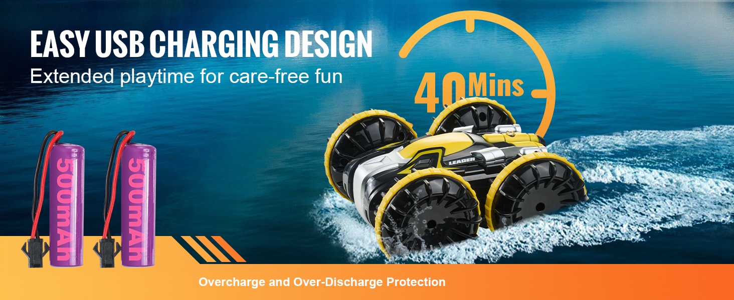 USB-lataus ja kahden akun järjestelmä mahdollistavat yli 90 minuutin yhtäjaksoisen leikkiajan. Ulkona leikkiessä voit pidentää käyttöaikaa entisestään kätevän varavirtalähteen avulla.