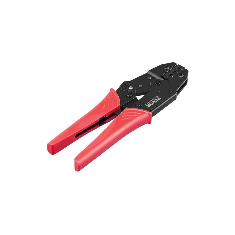 Monitoimiräikkäpihdit AWG22-10 (0.5-6 mm²) lämpökutiste-, nylon- ja holkkiliittimille. Kestävä teräs, säädettävä puristus, kolme värikoodattua aukkoa, ergonominen kahva, räikemekanismi vähentää voimaa, tasaiset puristukset, karkaistu 48 HRC leukapari
