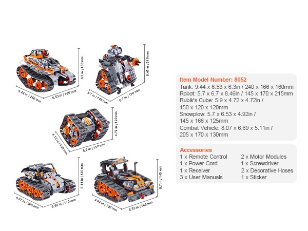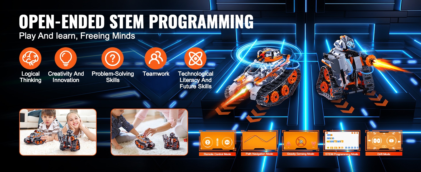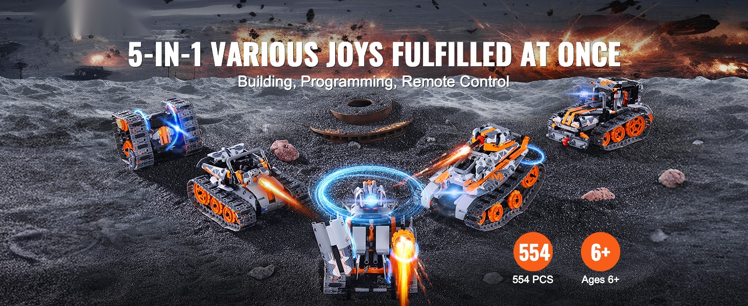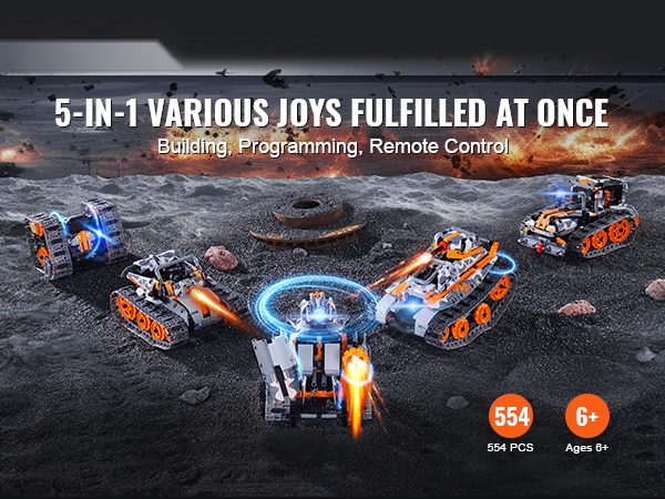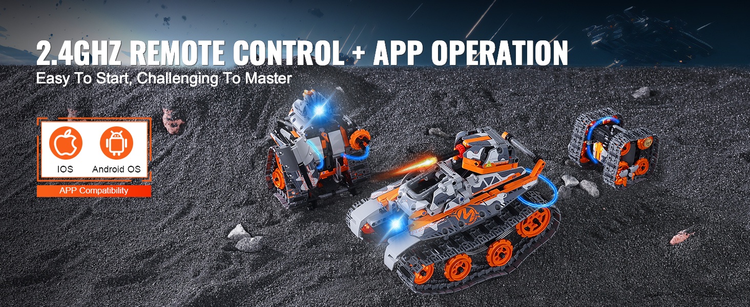 - 2-in-1 rakennussarja: voidaan koota radio-ohjattavaksi autoksi tai robotiksi