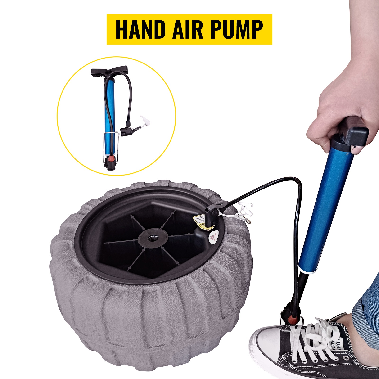 Pakkaukseen sisältyy käsipumppu renkaiden täyttöä varten. 2 kpl 13-tuumaisia rantapyöriä on helppo täyttää mukana tulevalla pumpulla, ja täytön jälkeen halkaisija on 13 in / 33 cm ja renkaan paksuus 7.1 in / 18 cm.