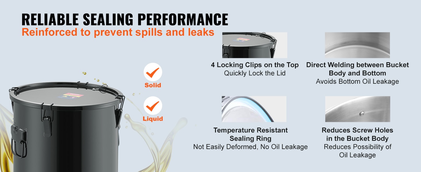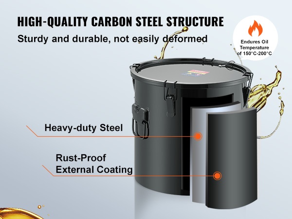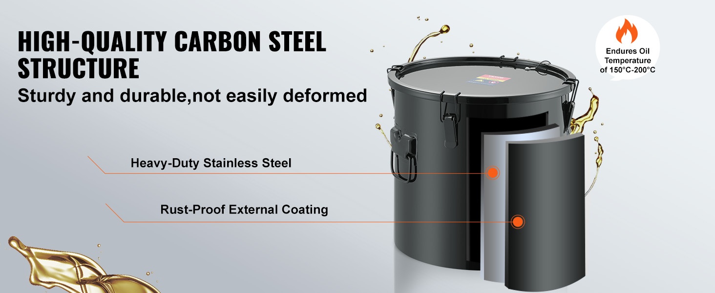 Hitsattu pohja ja tukevat lukitusklipsit kannessa auttavat pitämään öljyn varmasti astiassa. Tiivis rakenne vähentää vuotoriskiä ja roiskeita, jolloin työympäristö pysyy siistimpänä.