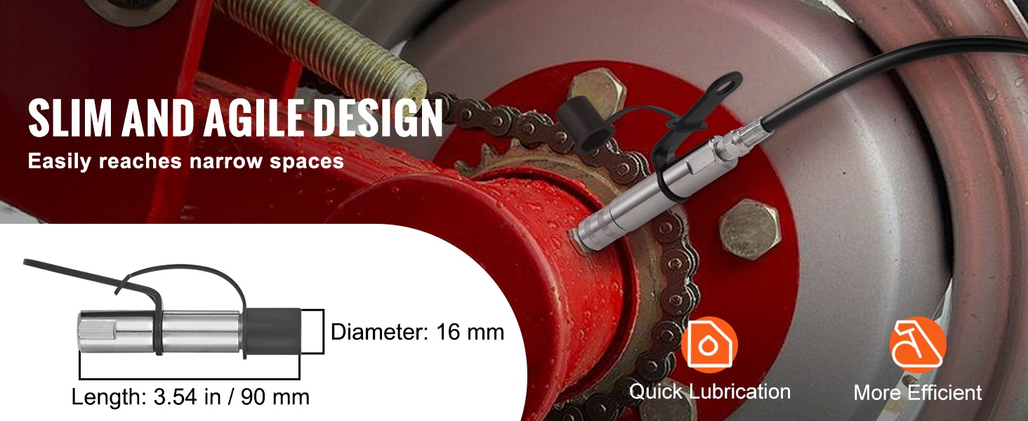Kapea ja siro liitin ulottuu helposti vaikeapääsyisiin rasvanippoihin, esimerkiksi auton alla tai koneiden kapeissa nurkissa. Suunnittelu helpottaa nopeaa ja tehokasta voitelua ilman turhaa säätöä.