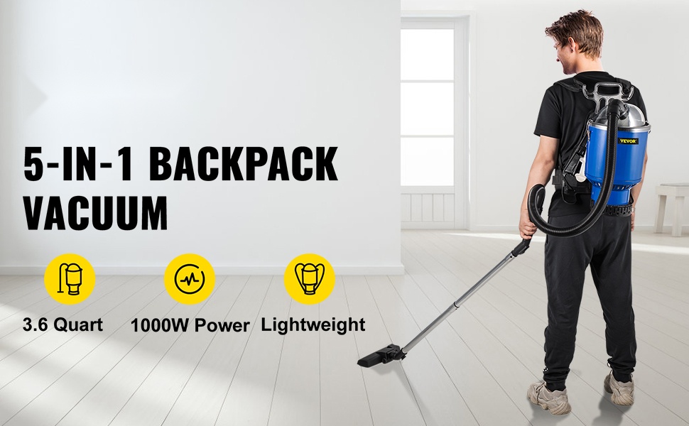 Reppuimurin paino on vain 13.4 lbs / 6.1 kg, ja säädettävä kantovaljas jakaa kuorman tasaisesti selälle ja hartioille. Tehokas 1000 W moottori nopeuttaa siivousta ja vähentää fyysistä rasitusta myös pidemmissä työrupeamissa.